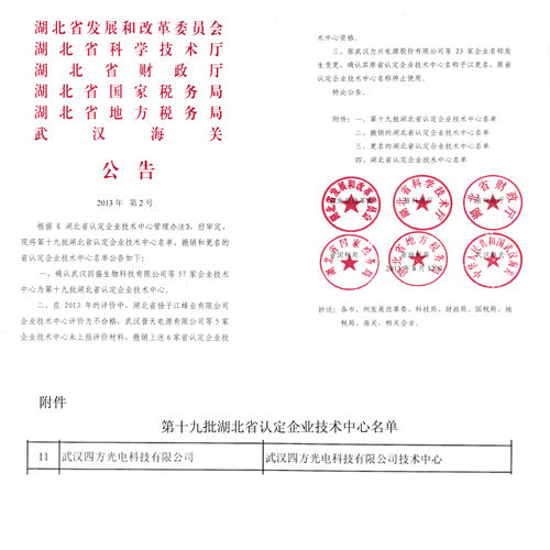 2013年8月12日,我公司技術(shù)中心被湖北省發(fā)展和改革委員會(huì)、湖北省科學(xué)技術(shù)廳、湖北省財(cái)政廳、湖北省國家稅務(wù)局、湖北省地方稅務(wù)局、武漢海關(guān)聯(lián)合認(rèn)定為“省級企業(yè)技術(shù)中心”,預(yù)示著我公司科技創(chuàng)新工作揭開了新篇章。