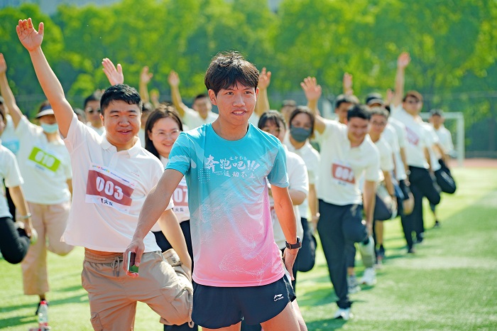 ▲專業(yè)教練帶領(lǐng)全員進(jìn)行活力十足的熱身操