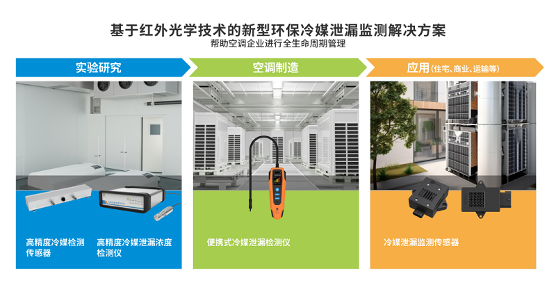 四方光電基于綜合的傳感器技術(shù)平臺和技術(shù)創(chuàng)新,已經(jīng)形成了包括空調(diào)企業(yè)實驗室研究設(shè)備(符合UL/IEC附錄LL和附錄MM測試要求)、空調(diào)/冷媒產(chǎn)線環(huán)境泄漏檢測儀以及空調(diào)配套的冷媒泄漏監(jiān)測傳感器等一整套完整的冷媒監(jiān)測解決方案,可以適用于各種制冷劑的監(jiān)測(如R-32、R-454A、R-454B、R-454C、R-290、R-1234yf、R-1234ze等)。